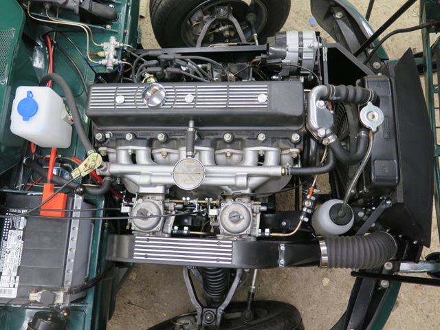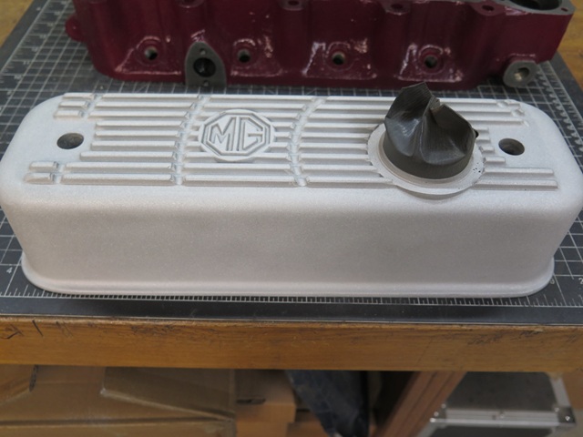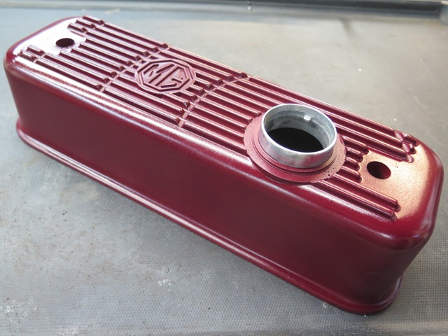 I like ribbed cast aluminum rocker covers. I'm not sure what it is, but to me, they seem to add a little gravitas to an engine bay. I don't, however, like the silver color that much. It's just a little too much shine or something. -- So the middle ground for me is a painted cover with just a little shine. This is the route I took on both my TR6 and GT6 cars. And as a small personal touch they both have a series of radiating arcs cut into the fins. -- I decided to continue the tradition on the MGA, though the shorter dimension doesn't let the arc pattern develop quite as much.