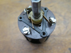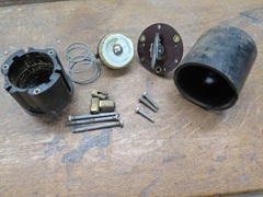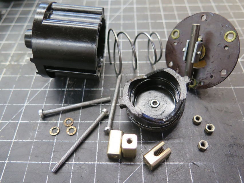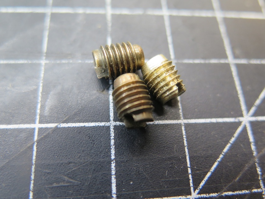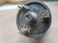 The bleed hole boss gets packed with this little cotton plug, which is in turn compressed by a set screw. This apparently serves as a rough adjustment for time delay. -- One little detail that I didn't notice until the end was the missing set screw in one of the electrical terminals. I only mention it because it turned out to be non-trivial. First, it's brass, which isn't typically an common hardware store item. Second, what appeared to be a very common 1/4-28 UNF thread was in fact a 1/4-26 BSF thread. The project was on hold for a week waiting for the die, but there it is, the new screw on the right.