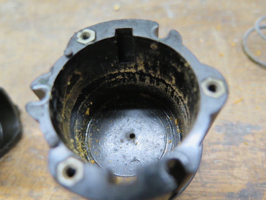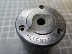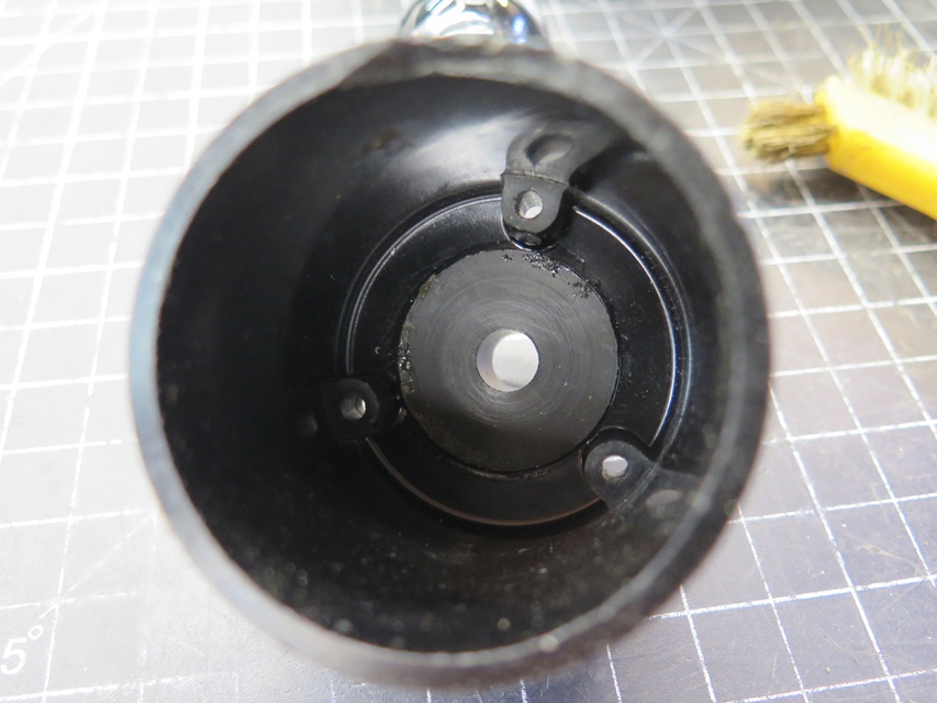 Before I spent any time on the piston or bore, the broken mounting nose seemed like a more pressing problem. -- I made a new nose with a thin flange. The idea was to glue the flange to the inside of the housing, with the nose protruding. I wasn't sure if this would work, but I had no better plan. I could determine the diameter of the nose from the hole in the dash (3/4"), but the length was sort of a guess from pictures found online. -- The body had to be bored out for the new nose to pass through.
