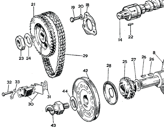 17H6680 Tensioner Assembly should always include the tensioner body and backing plate, internal spring and locking cam, the 17H31 Slipper head, the hex head plug with locktab, and possibly one AEC339 joint washer (paper gasket) . The AEC340 screw locking washer (2-hole locktab) can be cut in half to make two serviceable