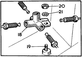 This stud is item number 19 in the illustration at right, used to secure the brake circuit 5-way fitting to the chssis side member. MGA 1500, 1600, and 1600-MK-II cars have the brake light pressure switch with tapered pipe thread in the top port. MGA Twin Cam and ARDB models have the pressure switch with tapered pipe thread in the inboard side port (different brass fittings). There are three different part numbers for this stud, all interchangeable. FHS0401 is the later standardized part nunmber. Picture of the stand alone stud here is close but not exact configuration.