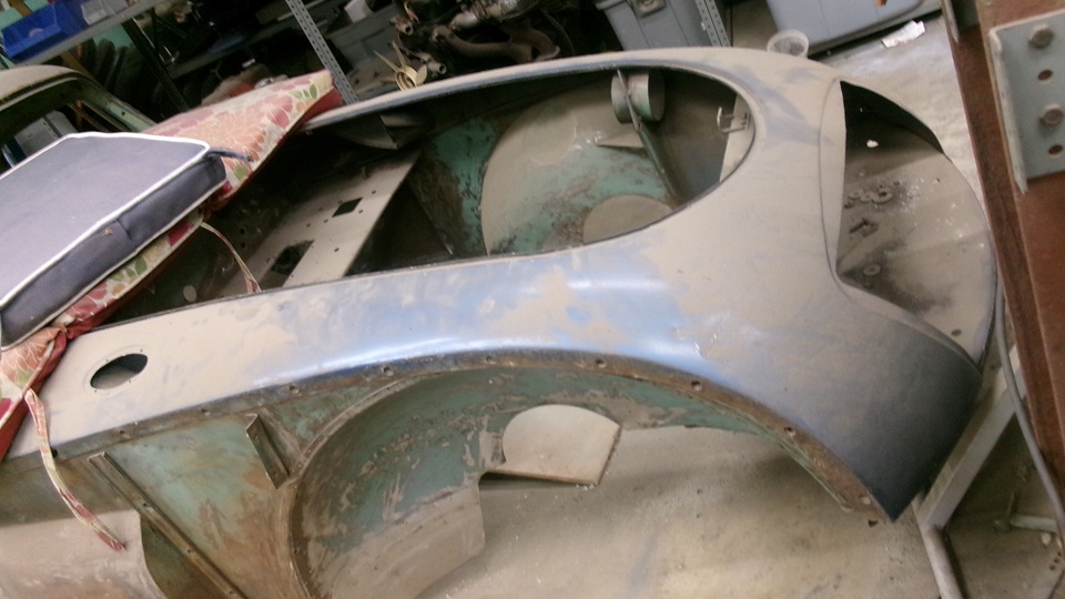 More body parts for the Coupe currently under restoration, the RF wing with a lower panel repair section already stitched in, more spare wings, boot lid and bonnet, two doors with complete roll-up window assemblies, and the fuel tank.