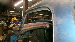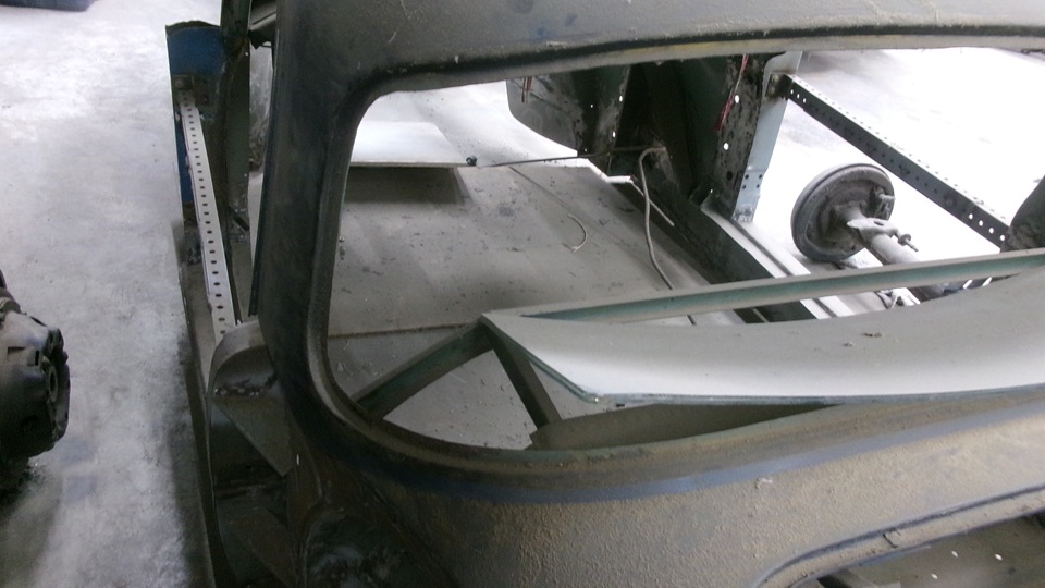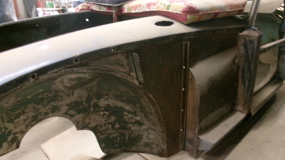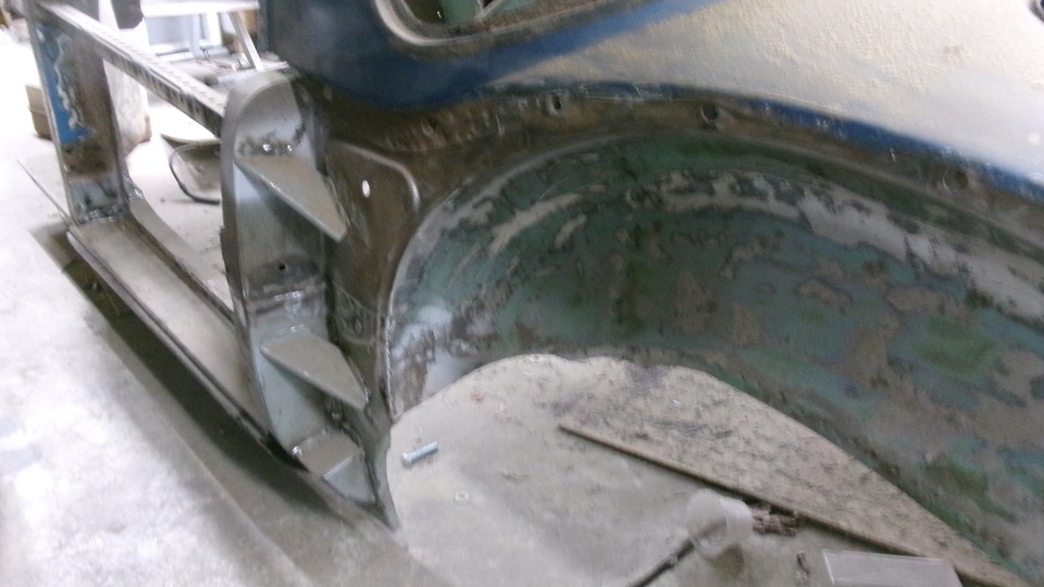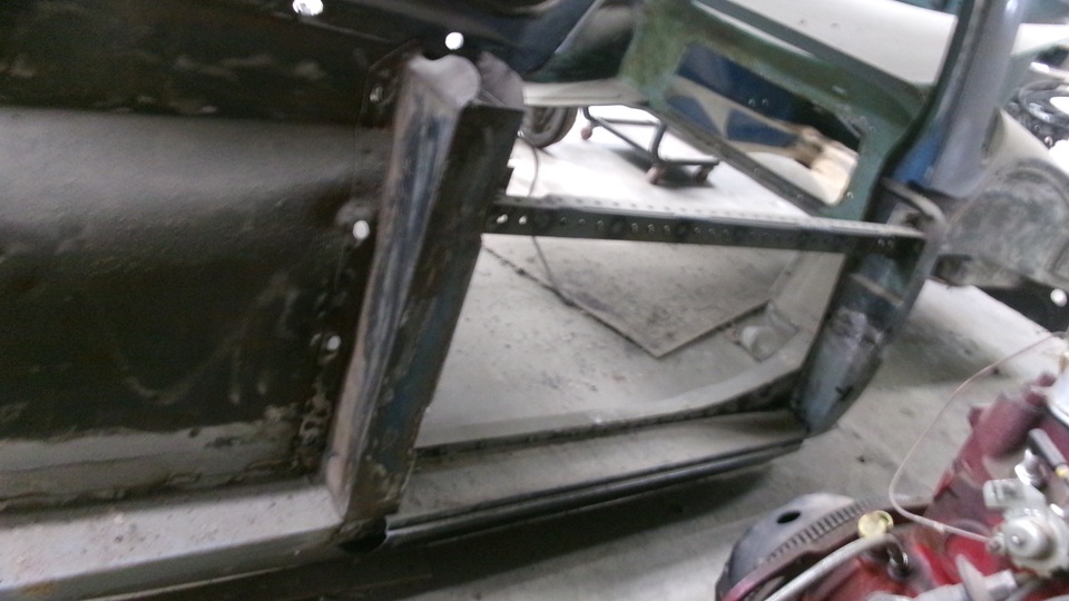 Yes, the rear axle is obstructing view of the body sill, but the body sills and door posts have been rebuilt. The frame has been repaired, about ready for cleaning and painting. The right side battery box was extended to accept a larger single 12-volt battery. The left side battery box has been modified to be a storage box.