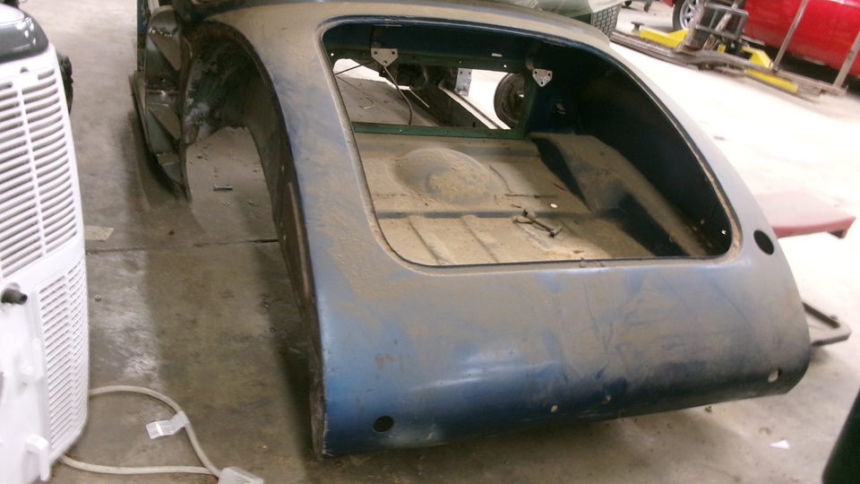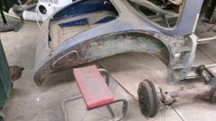 A rolling chassis for another MGA, tunnel parts, convertible top frame, and fuel tank in situ, front and rear main body sections separated at the sills below the doors, more fenders in blue. The more you look, the more you find.