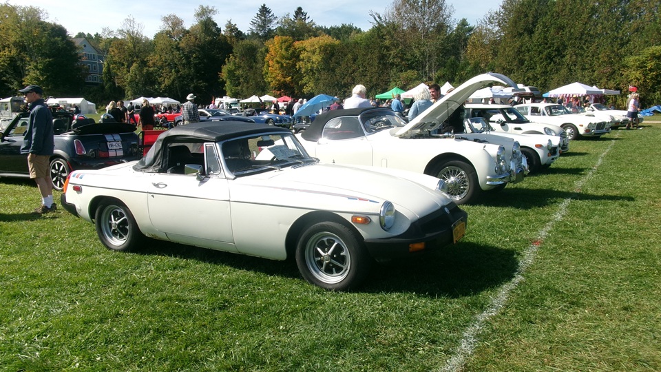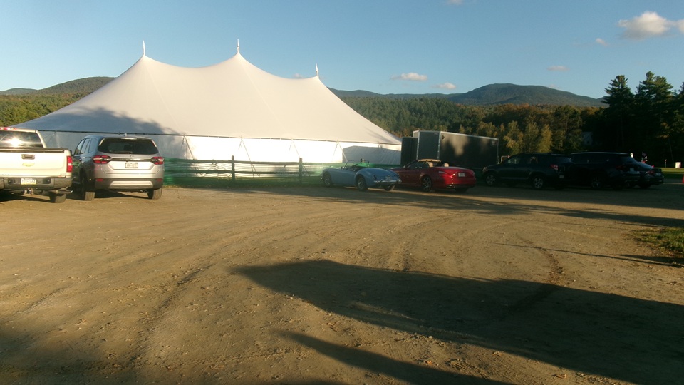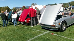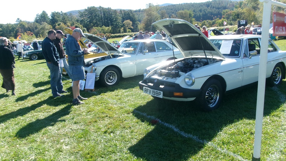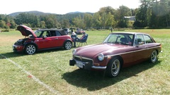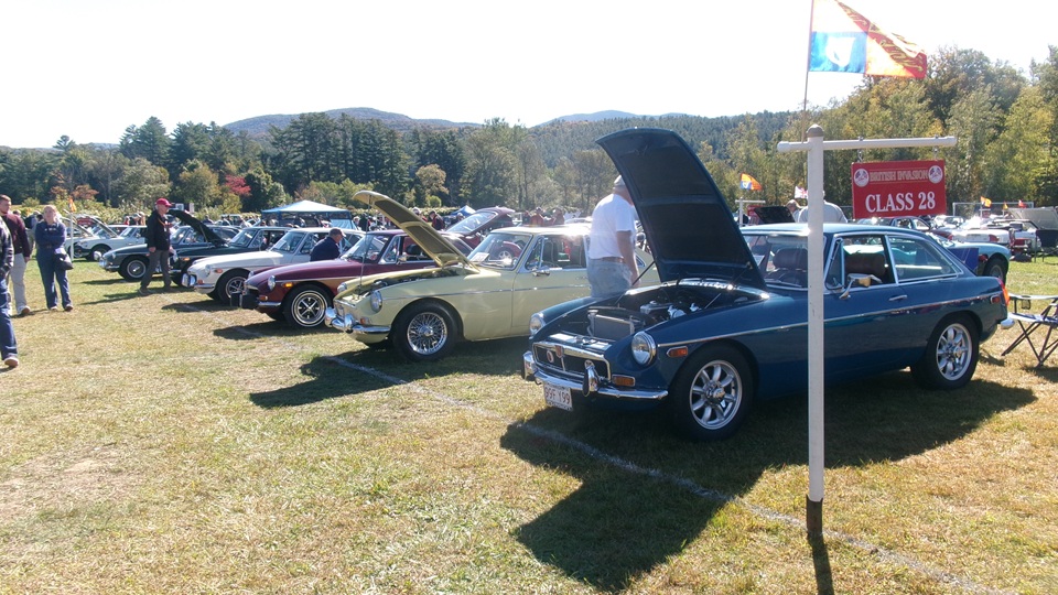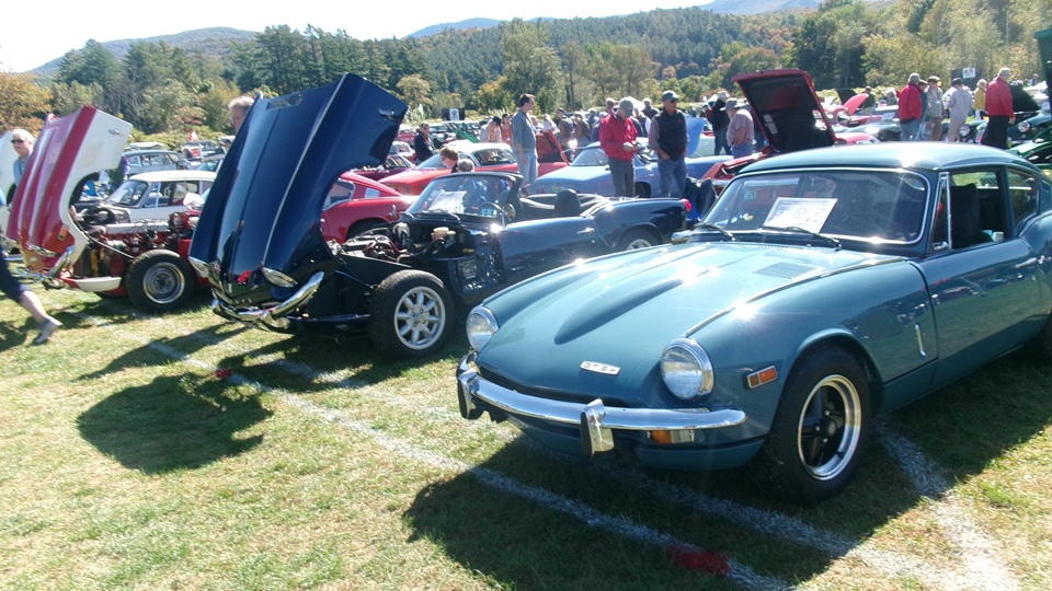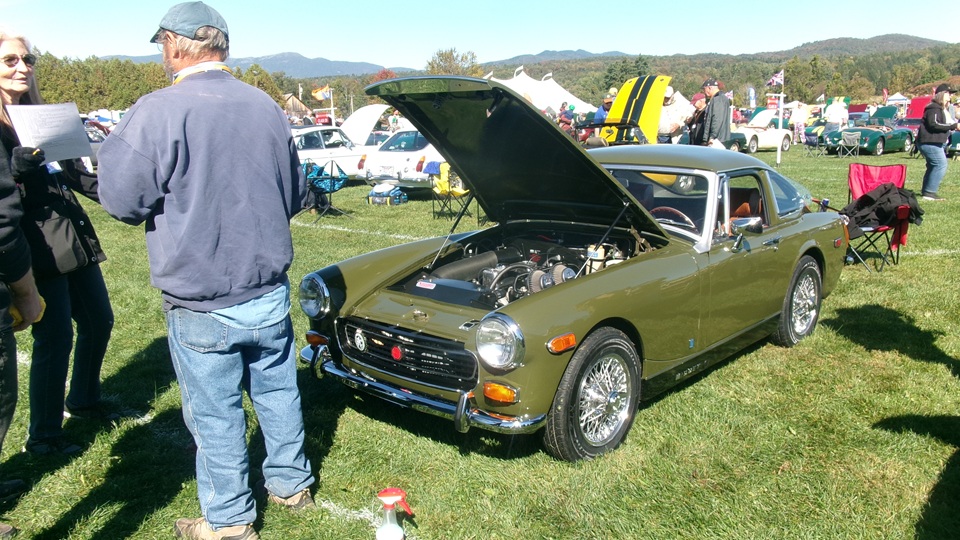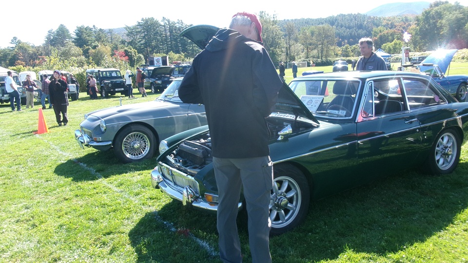 Then heading north through Vermont for an 5-pm appointment to check into The British Invasion car show in Stowe, Vermont, Turned off of VT-108 onto I-89 north, and promptly blew a head gasket while winding the engine up for the long uphill entrance ramp. Bummer, we don't have time for this right now. Cursory inspection revealed combustion gas blowing directly tout the back of the head gasket at the rear head bolt location. Hadn't seen failure at that location before. Oil pressure and water temperature okay, doesn't look to serious, so we opted to remove #4 spark plug to kill combustion and drop the pressure, and drive on running on three cylinders. Sounds like a Briggs and Stratton single cylinder with a bad muffler, but it runs pretty good on three cylinders. We cruised into the car show registration at the Stowe fairgrounds right on schedule at 5:30-pm.
