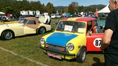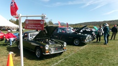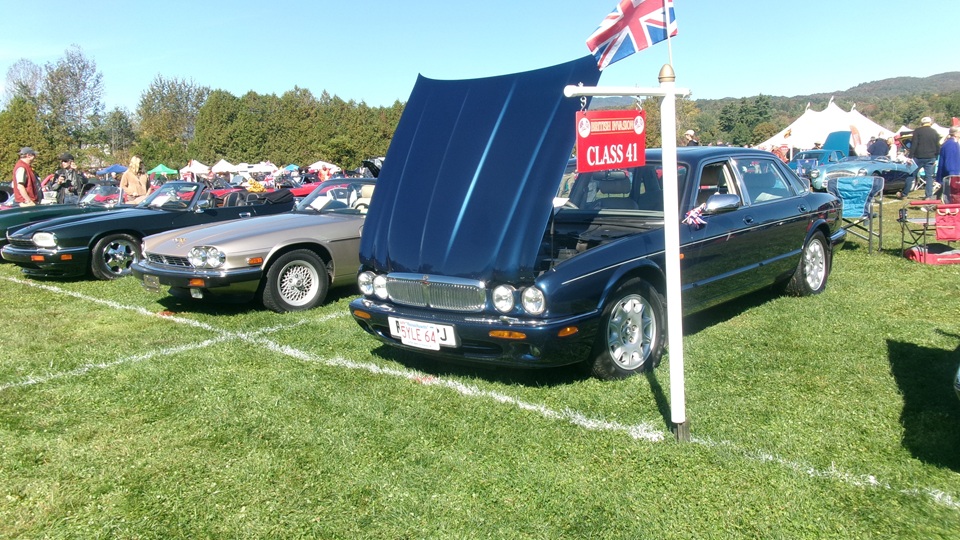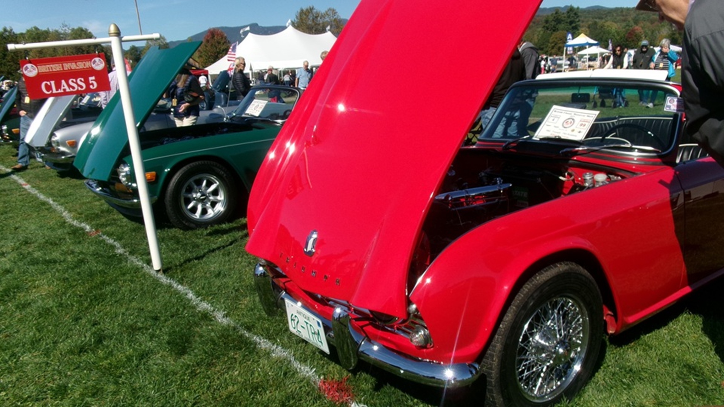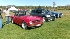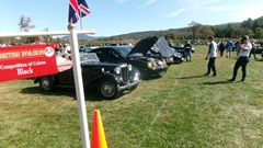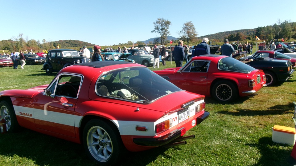 First incident for the week end was a dent in the LR fender of a Triumph, lightly grazed by a big Jaguar sedan. We picked up the registration packet, grabbed a beer and sat to chat with a few folks.