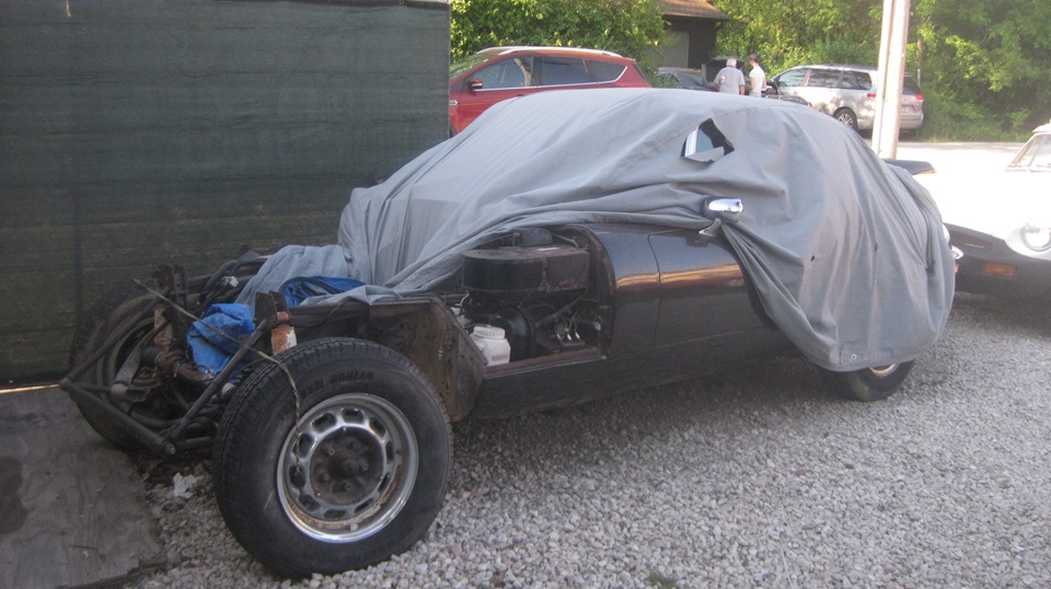 There was the white MGB with the front wings off, which I think is supposed to belong to Tom Raddaz's teen age son as a 'first car". It drove in under its own power, needing some tune-up. They changed spark plugs, then it was running on two cylinders. Good compression, good spark, correct wire order, no fire on 1 and 2. Quick diagnosis, no fuel in the front carburetor. Take the top off the front float chamber for a fuel check. "Don't touch the carburertors, they were fine before we changed the spark plugs". Okay, walk away. Half hour later it was running again. What did they do, besides change spark plugs again? Smack the front float chamber with a wrench. -- Outside an MGB with a weird paint scheme, but a nice fuel injected V6 and 5-speed. Woo-hoo!
