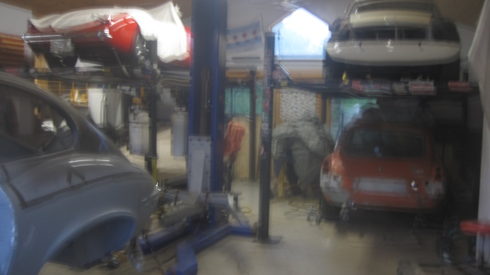 Still in town, so looking forward to Wednesday Night Garage Club. Been rainy and cold for couple of days, must have scared off a few of the regulars. This old camera is not going to do well in the dark atmosphere with poor contrast, so don't expect too much of the pictures.That's Tommy's Fiat 124 and Mustang moved outside for some maneuvering room. Just indoors a few of the guys were lifting a Jag E-Type 2+2 Coupe body shell off of a hoist onto a rolling dolly. Four more cars inside, two up and two down.