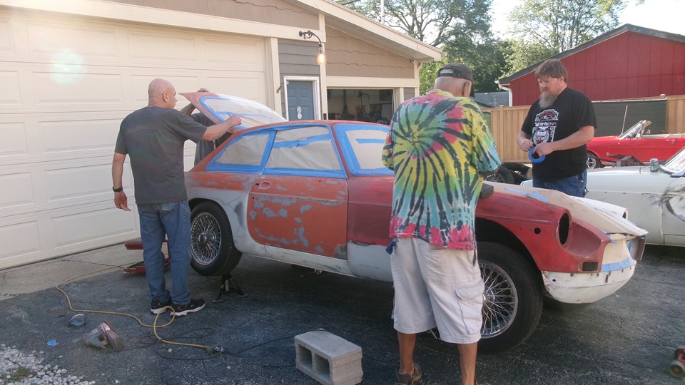 Since we are still hanging around the upper midwest, we drop in on the Wednesday Night Garge Club(again). The white MGB that was totaled out a few weeks ago has been poked and probed by multiple people placing dibs on various parts for recycling into other cars. The CMGC club project car has a little attention since last week, with some blue spot putty.
