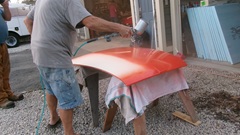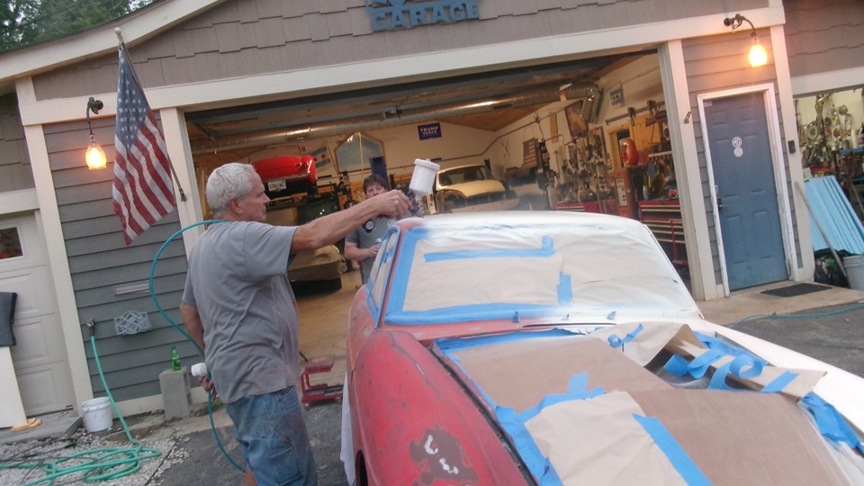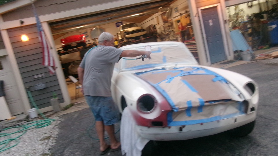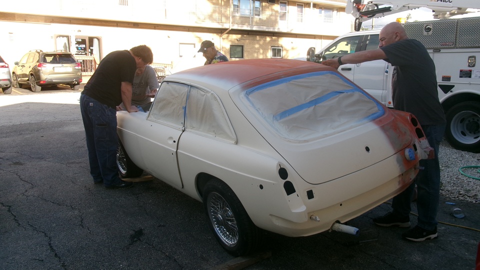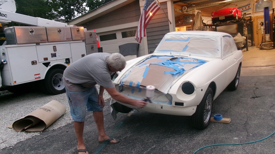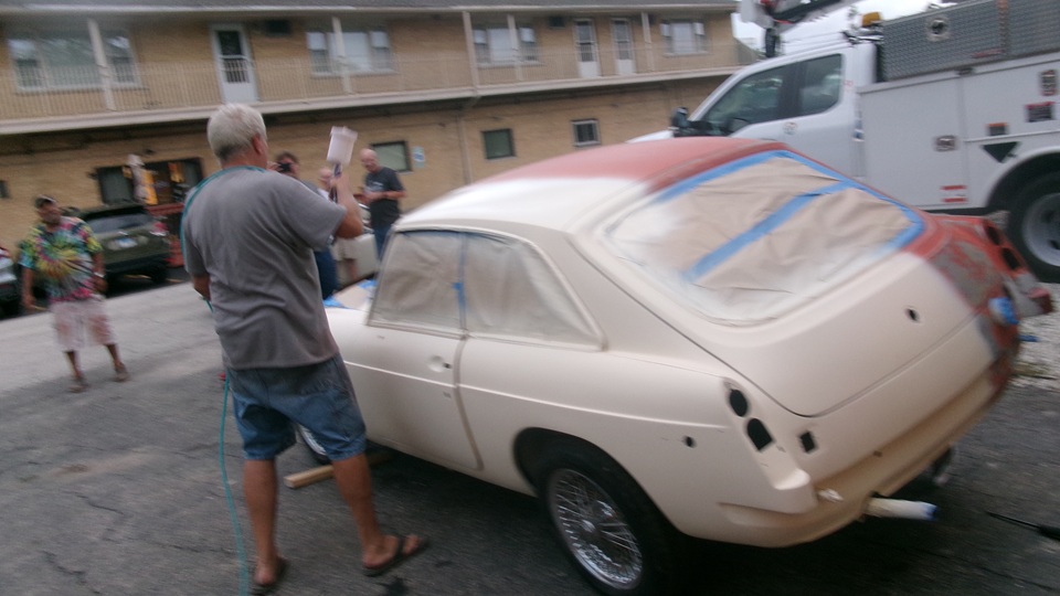 Last spots coverage, finishing an extra coat late evening with a hand held LED lamp, and putting it to bed for the night. This may be wishful thinking, but they would like to finish sand and, 2nd prime, finish sand again, and spray it Orange before (maybe) taking it to the British Car Festival for display on September 7. Check back later.