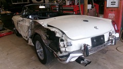 The white MGB on the low rack is Tom's son's car, which was just made running and drivable last month. Now most of the structural underbody work finished, working on spot patching and rust removal. The naked MGA rolling chassis recently procured is planned to become a California Fun Buggy.
