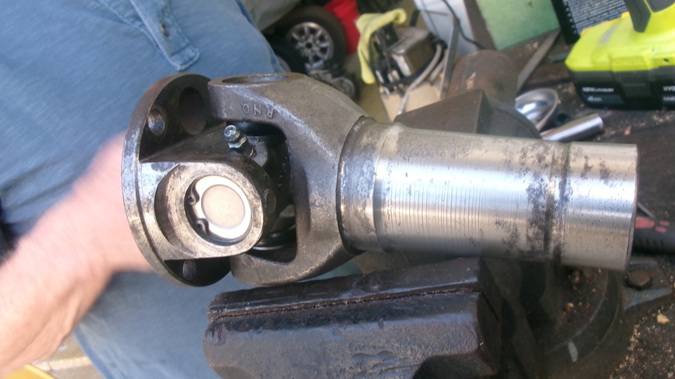 Tech Central in Bonita Springs, Florida, day after new years. Someone wanting to change four universal joints for rear suspension of a TR6. The first one had snap rings removed before the owner was stumped on getting it apart. One size larger than U-joints in the propshaft of an MGA or MGB, but same procedure. First picture disassembled. Second picture reassembled. Third picture in assembly with the mated half shaft. All of the joints were in very good condition, maybe no reason to be changing any of them. There was one yoke then an odd chip out of one edge, and the owner already had a new yoke in hand, so that one may be a chore for another day.