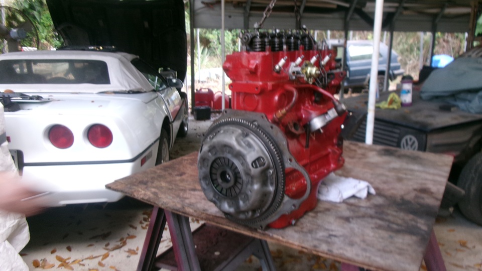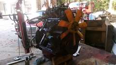 From the rear ,remove clutch, flywheel and engine rear plate. From the front remove crank pulley, fan, water pump, alternator and a few more small bits we will need to install the "loaner" engine. By 1-pm the 1800 engine was half naked.