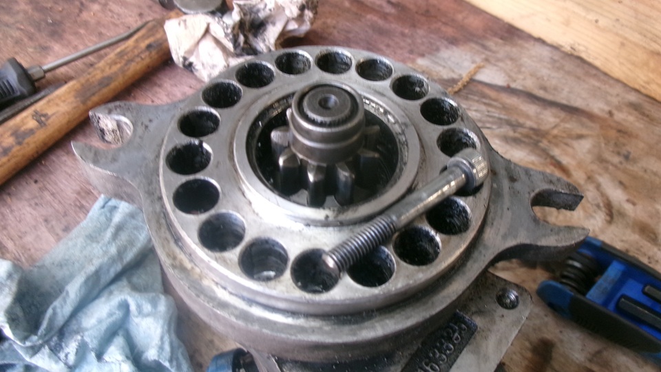 Slightly earlier start today, about 9-am. Time to throw all the bolts into the engine mounts, last few bolts in the bellhousing, intake and exhaust manifolds, hook up the exhaust pipe. Then a couple bolts for the starter motor before kicking it off the jack stands. That's where we ran into an unexpected problem. With the starter base plate bolted tight, the rest of the unit was wiggling bit. No good. take it back out for a better look.