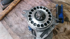 Extract the atchometer drive gear and snap rung and two woodruff keys from the old camshaft to install on the new one. We used a 3-jaw puller to get the gear off, and hydraulic press to reinstall it. Finally the new camshaft was installed, properly aligned with with sprockets and timing chin and tensioner. Before installing the timing cover, we couldn't find the oil thrower ring. After wasting nearly an hour searching everything, we gave it up for lost cause in the dark, and installed the cover with loose screws, to be taken up later. Wet, windy and hilly here. Drop on a head gasket and the head and rocker assembly and valve cover to close it up for the night. Leave it hitched to the engine hoist, throw a towel over it, and call it good for the night.