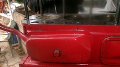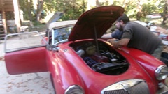 The rest was just chores to install the carburetors, distributor, alternator, radiator, fill with water and fire it up. That was almost on schedule, done by a few minutes after 4-pm. Peachy, put the bonnet on and be ready to roll. -- Unfortunately, not the end of the work day. We still had to disassemble the 1800 engine to get the bare block and cylinder head to the machine shop first thing tomorrow morning. Yeah, but disassembly is pretty easy, finished before 8-pm. Then we dropped the block and head into the trailer, packed up a bunch of tools and cleaned the place up a bit before jumping on a very late lunch,and then some WiFi time to post up these photos and notes.