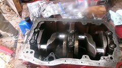 We cleaned this up a bit, then installed main bearings, crankshaft and pistons with con-rods.