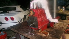10-am start, drain coolant and oil, remove radiator, carburetors, manifolds, distributor and other peripheral bits. Disconnect bellhousing bolts and engine mounts, lift out, and by 2-pm the engine was sitting on a work table.