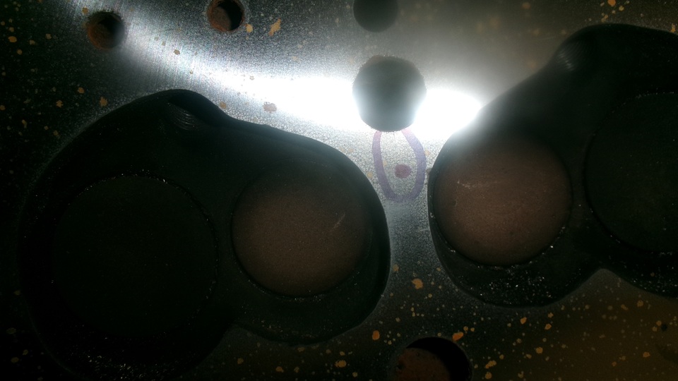 The machine shop had noticed a small crack in the head, starting from one of the water passage holes. Not a big deal, except you don't want the crack to run any farther, and maybe end up crossing onto a valve seat. The fix is to drill a small hole at the end of the crack so it will not progress any farther. In that location the head gasket will cover the drilled hole. Pictures with and without flash, before and after drilling. I was surprised how thick the head was t that point while drilling through into the water jacket, much thicker than it was at the water passage port. Since it rained last night, there was some rust on the fresh ground surfaces of the head and block. This looks better after running an oiled whetstone over it.