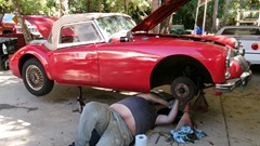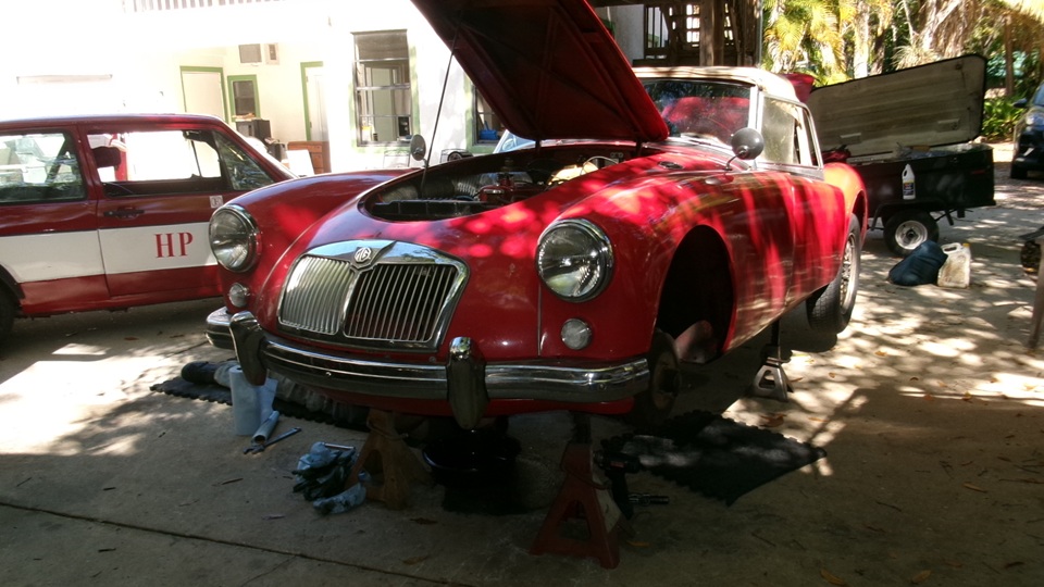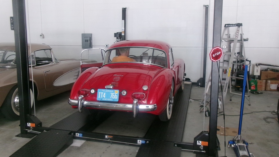 on Fri Jan 3 we were working on right rear brakes of an MGA 1600-MK-II Coupe at Tech Central. On Jan 30 we were checking out the stuck bonnet latch while the car was in for paint touch up in Bonita springs, FL. Today we were off to Fort Myers, FL to visit the red Coupe at its home base where we had a drive-on lift to help with access to the stuck bonnet latch. The Coupe drove home from the paint shop, but died at the door before entering the shop. Turns out it ran out of fuel, so a few gallons of gas got it running again, so it could be driven onto the lift.