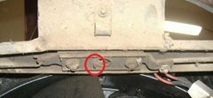 We had the latch pin pusher tool from last week, and the car on a lift for much easier access in front, much more workable. We tied back the bonnet release pull rod, spread the grill fins slightly, and spent an hour or more poking the bottom tip of the latch pin around with some vigor, but still no luck. then we pulled out the parts list diagrams to study the assembly, and checked some pictures of the latch from my web site. We finally figured out that the bottom plate of the bonnet latch was installed wrong, swapped end for end, so the blocking tab underneath was on the wrong side of the latch pin passage port. The picture below right is correct (see tab in red circle). The red coupe has this tab on the opposite side. That allows the latch pin to be pushed off center by the spring drawn latch slider so if the bonnet is pressed down a bit too far, the tapered latch pin head can be caught below the edge of the bottom plate.