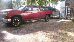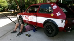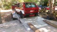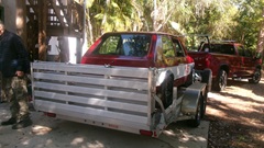 There was a marginally funny (but serious) issue while driving the Rabbit onto the trailer. The truck was last used to tow a different trailer, and it had the wrong (too small) hitch ball on top, so the trailer hitch was not securely coupled. As the car was driven onto the tail of the trailer, the trailer tilted, and someone who was standing on the front of the trailer was casually launched over the side, not significantly injured, other than his pride. When the car was backed away, the trailer hitch landed back on the hitch ball. Not long to crank up the trailer hitch jack to change the tow ball on the truck, and get it securely couple up. Then drive the Rabbit properly onto the trailer and get it tied down ready to travel.