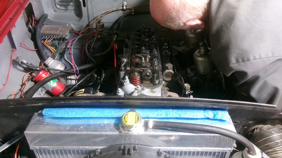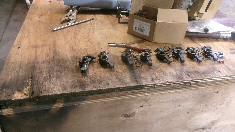 My new radiator that doesn't fit has been moved farther back on top of something else, because the guys wanted to use the engine box as a work bench. Tina, the MGB race car was getting some attention. This is the second Friday they have been trying to change valve springs from single to double springs. They do have all of the correct parts required, but they are still going to the School Of Hard Knocks, trying to change the valve springs without removing the head. Just a hobby, maybe, as they want to spend more time than money, to save the cost of a new head gasket. Today they removed the rocker shaft assembly (loosening four head bolts) to remove the rocker arms, then reassemble the shaft and pedestals.