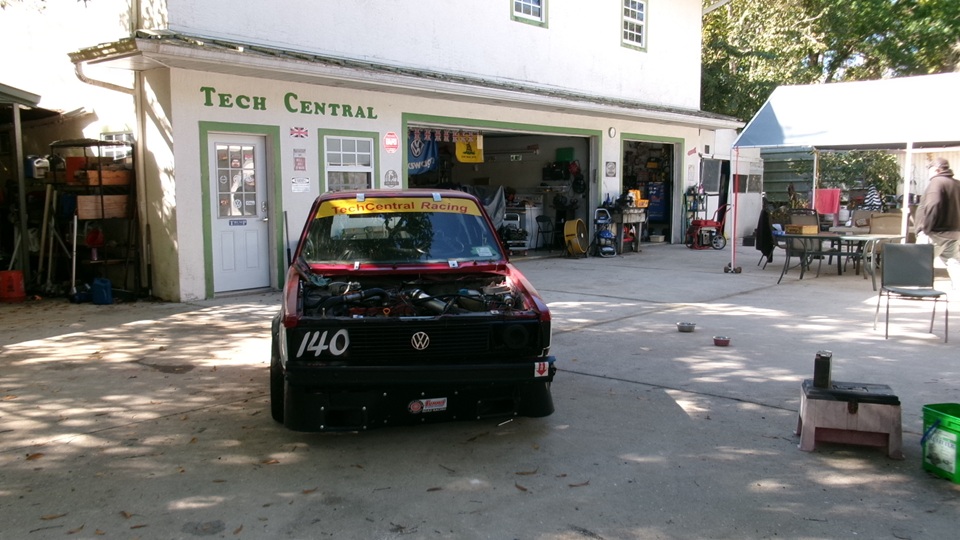 Good morning Tech Central Racing. Don't be fooled by two VW with the same racing number. They never get out on the same race dates.The one on the forecourt is the Rabbit that returned from Daytona with a broken shifter last week end. On the lift in the shop is the Scirocco with engine out for a while, and Jerry in the back tinkering with the engine.