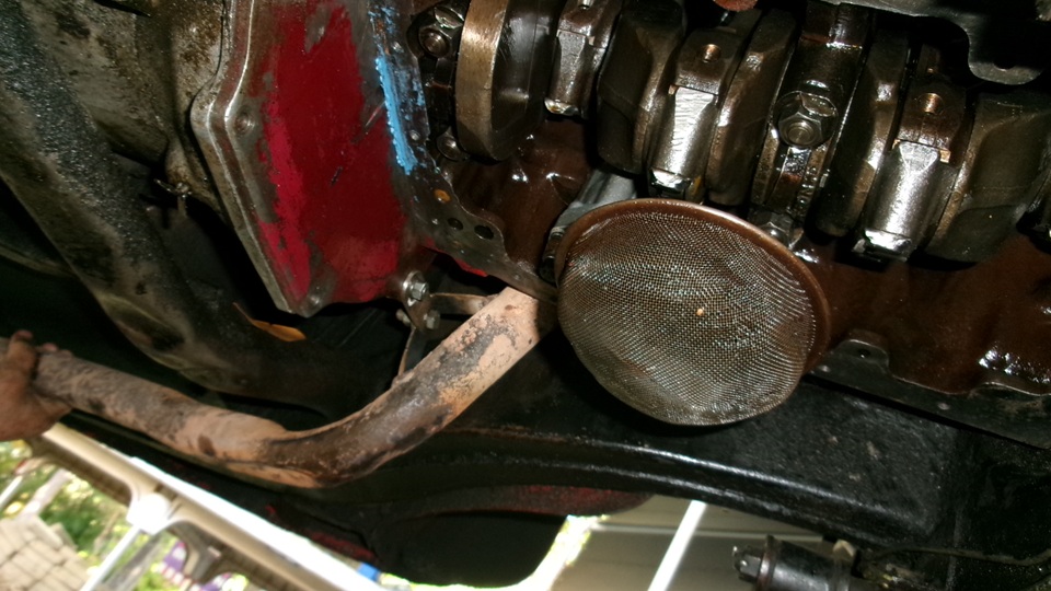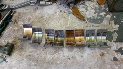 There is the picture of all of the old half shells. #4 looked pretty good, #3 had the most copper showing, but the crank pin journals still looked okay, glad we caught this when we did.We cut the oil filter open to see what we could find inside. the oil didn't look too bad, but there is a little spring in that picture that was part of the filter assembly, likely for the bypass pressure relief valve in the filter. Cutting the filter material loose to fan out revealed lots of debris like fine sand, particles small enough to slip through the mesh of the oil pick-up screen. The sump had more debris in larger particles that wouldn't fit through the pick-up screen. Again, glad we caught this issue when we did. We may chat later about why the rod beings may have failed. Just enough time to clean the oil pan and get it reinstalled before dark (with the two bottom bellhousing bolts. Spin on a new oi l filter, Fill with oil, and crank it 40 seconds with spark plugs out until it was showing oil pressure. We also did a compression test before installing the plugs and firing it up. All is well that ends well. Adjust the front brake shoes before reinstalling the wheels, kick it off the stands, pack up and on out way by 7-pm.