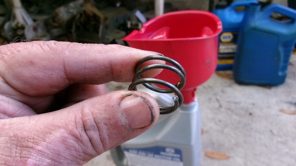 the pan. A fat short compression spring with closed end coils to have flat ends, may be some sort of force or pressure control spring. At the time no one could identify it, not like any car part ever seen, not an MG or VW part, and why was it in the oil drain pan? The answer was revealed "later tonight "as I was posting Thursday's photos and notes. Looking back to the last row of pictures from Thursday at the open oil filter can, this spring is just peaking out of the oil puddle in the can. It is apparently the filter element end load and bypass pressure relief spring from inside the oil filter. We had a second drain pan to catch the dribble when the oil filter was unscrewed, dropping the filter into the second pan with the dribble. That pan went to the work bench while the filter was being cut open. Then the filter can was dropped back into the pan, and a bit later the can was tossed into the trash while the remaining oil from the filter was poured into the first drain pan, so the second pan could be cleaned. Mystery solved, what is the spring and how it got into the primary oil drain pan.