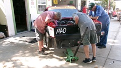 Bit of a crowd and tight parking at Tech Central on slightly late arrival. We have driven the MGA all of 12 miles with the new rod bearings and clean oil, and the oil pressure is perfectly good like 70-psi at idle with cold oil, 50-psi at idle when warmed up just a bit. But as my skeptical navigator is fond of musing, we will have to wait to see if it holds up, or which shoe might fall next. The racing Rabbit has received some new engine mounts, currently needing some alignment for one more bolt to be installed.