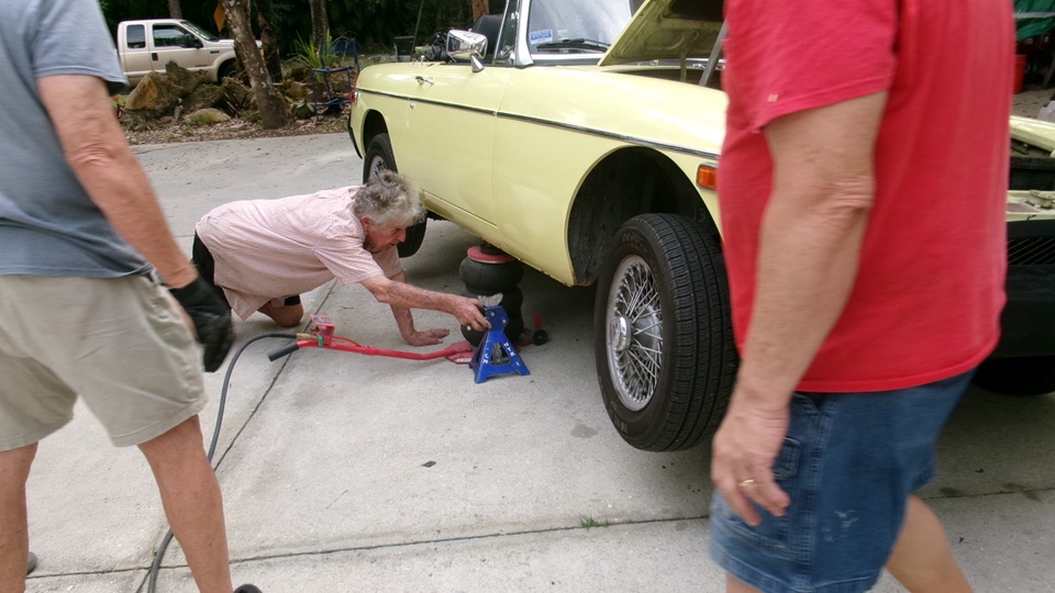 the guys got to work with the pneumatic bellows jack, which actually works quite well once you get the hang of it. Sometimes it may seem a little wobbly half way up, but it is easy to use and has nice high lift. Just be sure to use a good jack stand along with it. With one guy pushing pedal, one guy working a vacuum bleeder, two guys regularly refilling the small clutch master cylinder reservoir, it wasn't long to get the job done, and the clutch works well with no new parts required.