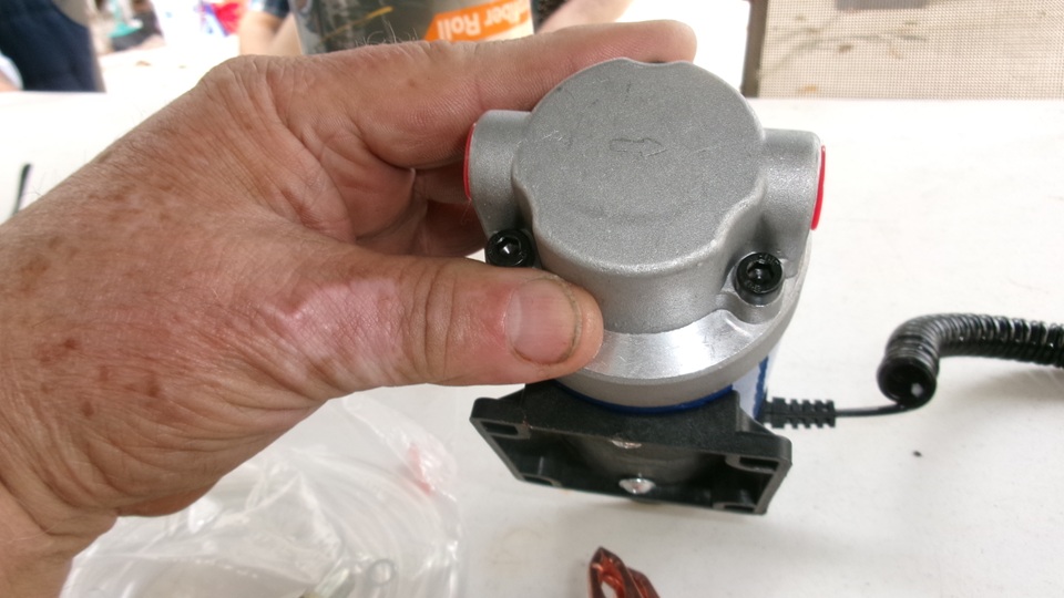 screw in hose barbs and some plastic tubing, battery power clips, a simple on-off switch. On one side there is a plastic mounting flange with four small screw holes, like it could be permanently mounted somewhere. Looks like it may have a permanent magnet motor and an eccentric rubber impellor pump. It struck me as being too heavy, so I'm not interested in carrying one in the Magic Trailer.
