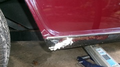 That incident would trigger a discussion and a quick tech session on a similar rust hole in the left side body still of the TR6. Jack it up for easier access, and grind away any abnormally thin rusted metal, keeping full thickness metal. Then grab an aerosol can of expand in place packing foam. Spray the expanding foam through the open hole to fill the cavity inside, until the foam is bulging out proud of the surrounding surface. When the foam has set up, dress it off with a spaghetti file, sand it flush, and it will be ready to smooth out with body diller, sand and paint. Crude maybe, but quick and effective for a not too expensive road car.