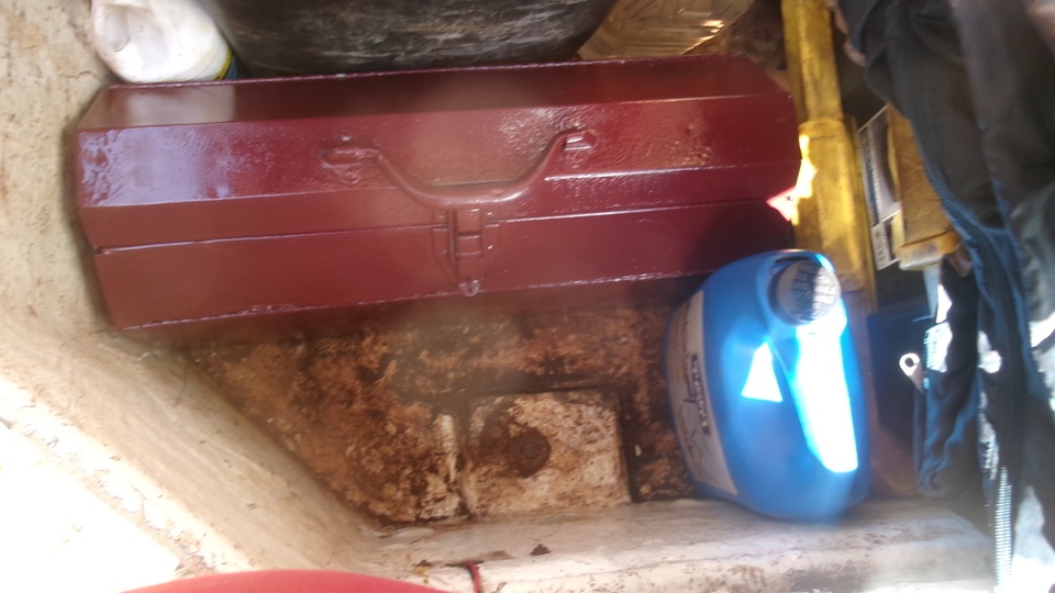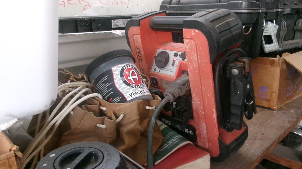 Good morning, work day at Tech Central. It is notable that our friend with the MGB currently undergoing the clutch replacement was feeling generous, and procured four new 18-volt battery packs for the large assortment of power tools. We had been down to three, one junk and only two that held charge. Now there is a full compliment of good batteries on the 6-pack charger. the yellow MGB needing to be moved out of the way was displaying a small rust hole in the right side body sill.