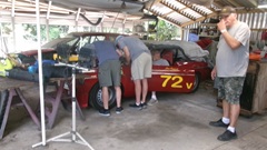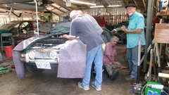 after which they were anxious to get the car out. But I was insisting to drill the alignment holes through the hinge brackets so they won't have to fight this again next time the bonnet needs to be removed. As was, there were holes through the hinges, but no holes in the bonnet brackets. That means this bonnet was a replacement part since the last time it was drilled. The existing holes were 5/32" where I was expecting 1/8". No problem, just grab a 5/32" drill bit from the Magic Trailer, and a power drill with one of the new batteries, and in just a minute there were four new holes all in alignment, ready to pin the bonnet in place next time it needed to be reinstalled.