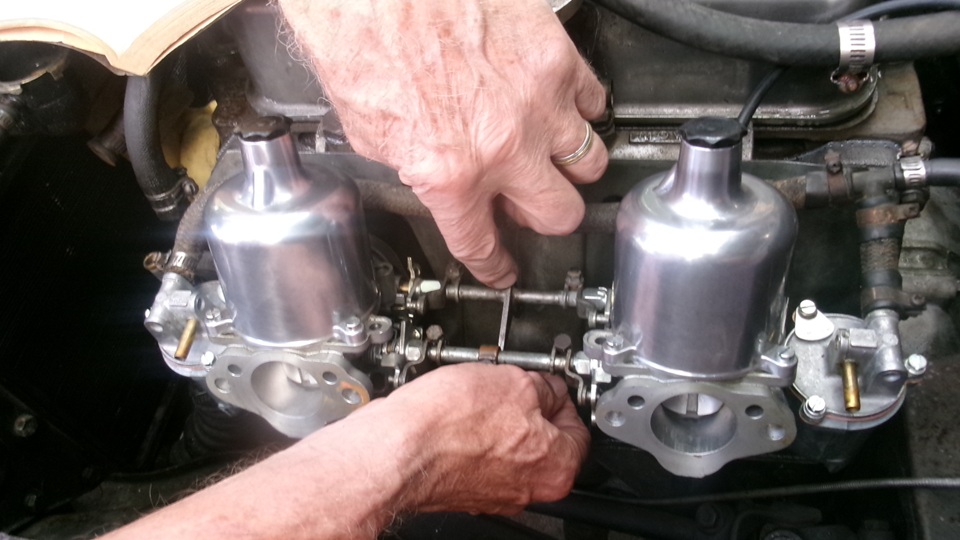 Back to the MGB with fresh clutch, with engine and gearbox already back in place (last week). The swarm was heavy into this with multi-processing., installing the radiator with mounting diaphragm, generator, oil filter, starter motor. Also connecting the exhaust pipe flanges to the exhaust manifold, and installing carburetors. When the clutch slave cylinder was installed, there was time spent with a stubborn bleeding process. There was a fair amount of fettling with carb linkages, as frayed pull cables needed special attention, and not everyone was intimately familiar with the full configuration of the linkage attachments.