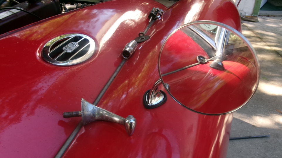 Okay, back to the second project, things we were supposed to do for our MGA on Thursday (except it was raining then). Jack the font to remove a wheel and splash panel for access to install a new right side wing mirror. The old broken pedestal to the left of the new mirror. Quick and easy, and reinstall the splash panel.