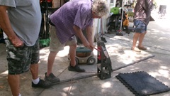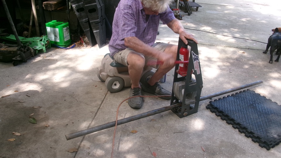 Firing up Tina, the wannabe race car. I think they just like to hear it run once a week. Today they get srtarted on fabricating a roll cage, beginning with two sides of the main hoop. They bought this hydraulic pipe bender, at least two years ago, knowing they would eventully be making a roll cage. I saw them using it once when it was new, but I think theywere only bending exhaust pipe tubing then. Now they are all anxious to see how it does on thick wall tubing, assentially 1-1/2" steel pipe.
