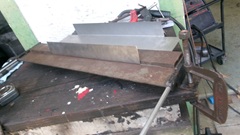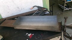 Off to Tech Central again with a bit of a mission (or hobby). We will try to repair (rebuild) a 50 year old steel hip roof tool box. We are rather fond of this box, because of its thin walls and space efficiency (and limited space in the Magic Trailer). You can't buy a replacement like this any more. The problem is, the trailer is often wet inside,so the toolbox has been rusting badly. We have not been able to pick it up for three years, as there is no bottom left in it. After inspection, the first move was to cut one inch from the bottom of the side walls all the way around. And lots of penetrating oil on the lid piano hinges.
