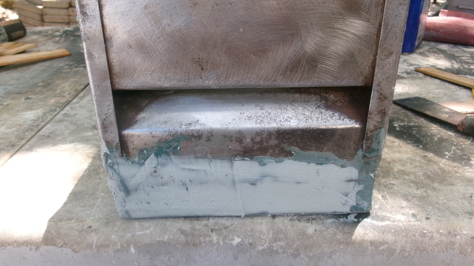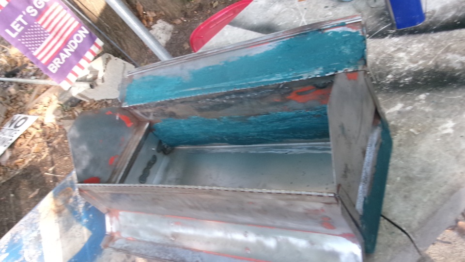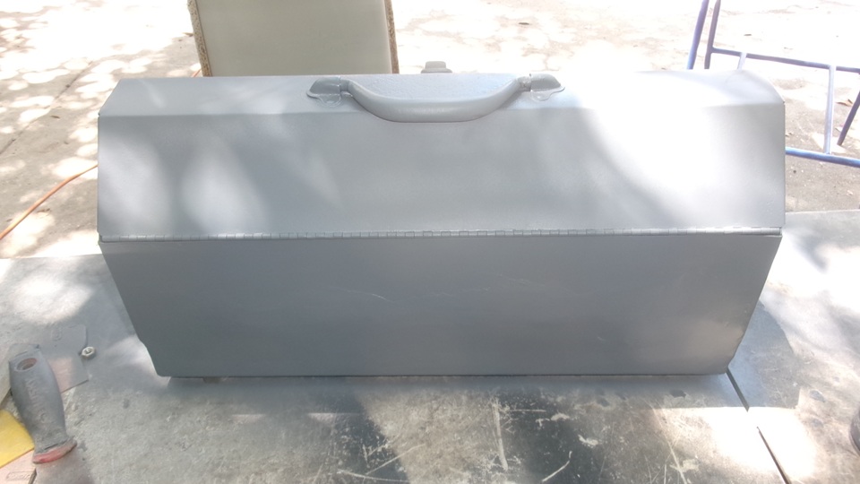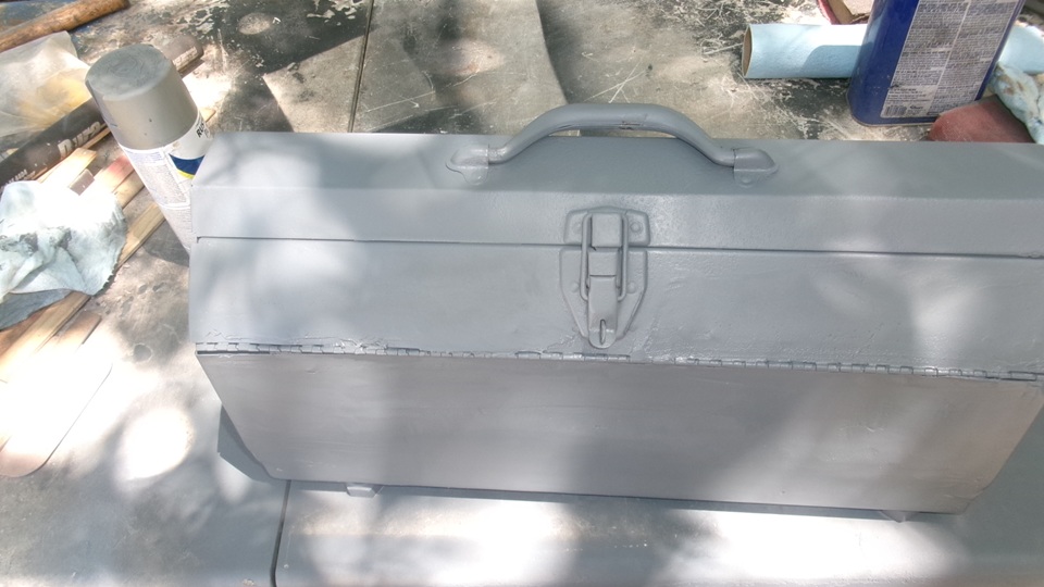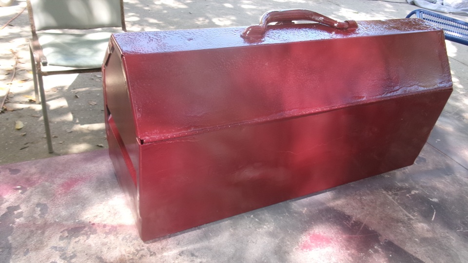 That was the easy part, just spray the primer from an aerosol can. Spray inside first,working through all of the inside corners with blow-back. Spray inside the covers, and over the ends where the cover will overlap, then close it up so we could hold it by the handle. Sitting just over the edge of the table, spray around all for sides. Tilt it 45 degrees on the edge of the table, spray half of the bottom, rotate 180 degrees to repeat on the other half of the bottom. Holding it high by the handle, spray one last pass around all of the bottom corners,and set it down on four big hex nuts. Flip the handle over a couple of times while spraying that last. Wow! That's a lot different from what it looked like yesterday morning.