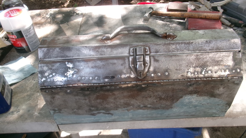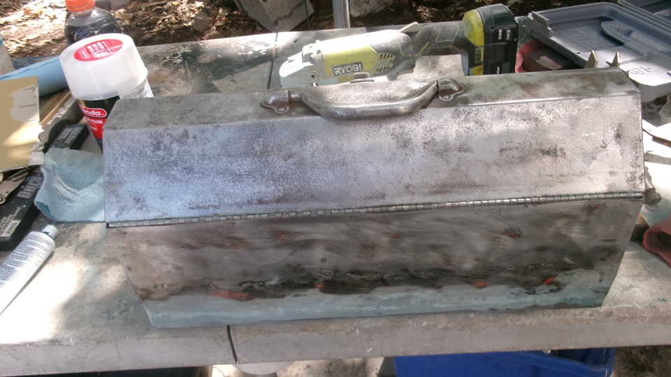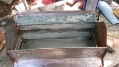No need to cut the tray down, leave the 1-1/2" overlap, and put two pop rivets in each end to hold it in place. No spot welder handy, so spend some time with the MIG welder stitching in tack welds every 1/2" at the edge of the new metal inside, both sides (not at the ends where they hide inside under the end shelf gussets). Then more tack welds all around the outside to secure the bottom edge of the old metal. Then half an hour with a flap wheel sander in an angle grinder removing sharp burrs from all the tack welds. Some of the original spot welds for one of the hinges had broken loose along with some slightly bent edges at top of the side wall, so more time with clamps and tack welds to re-attach the hinge. Then what must have been two hours with a Scotch-Brite wheel in power drill and the flap wheel sander, buffing off all of the old paint and rust inside and out (should have been a sand blasting job). After digging ourselves out from under a ton of grinding and sanding dust, blow away remaining dust and wash the box down with lacquer thinner, like clean enough to paint (but not yet). It was looking pretty good, so time for pictures.