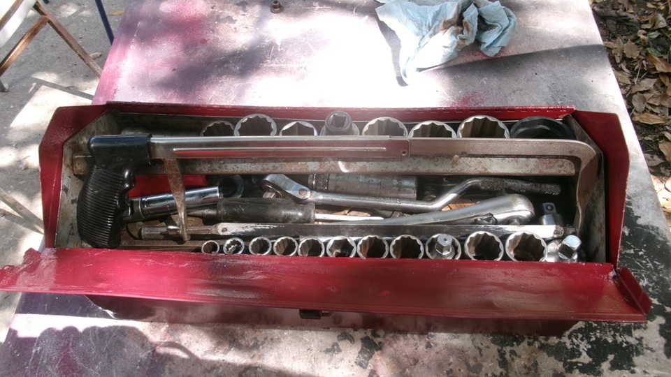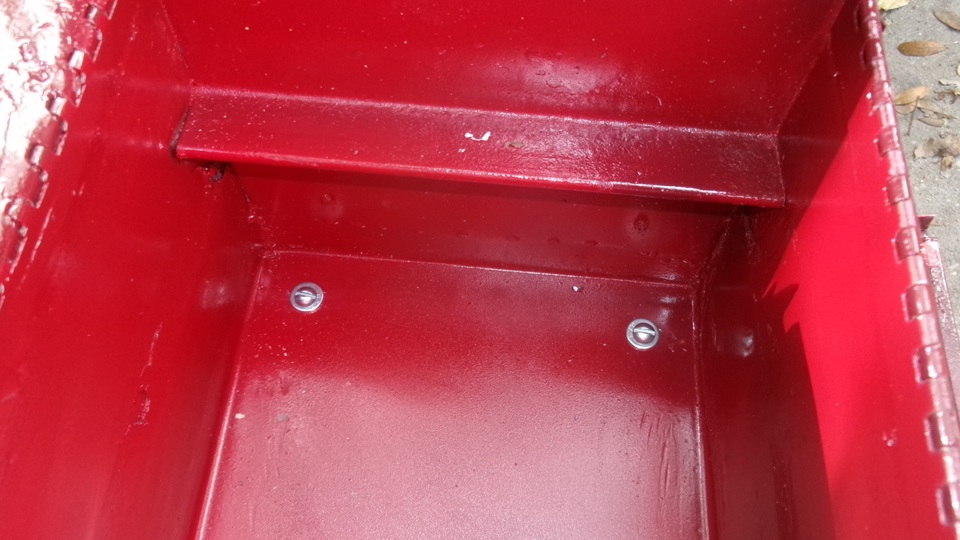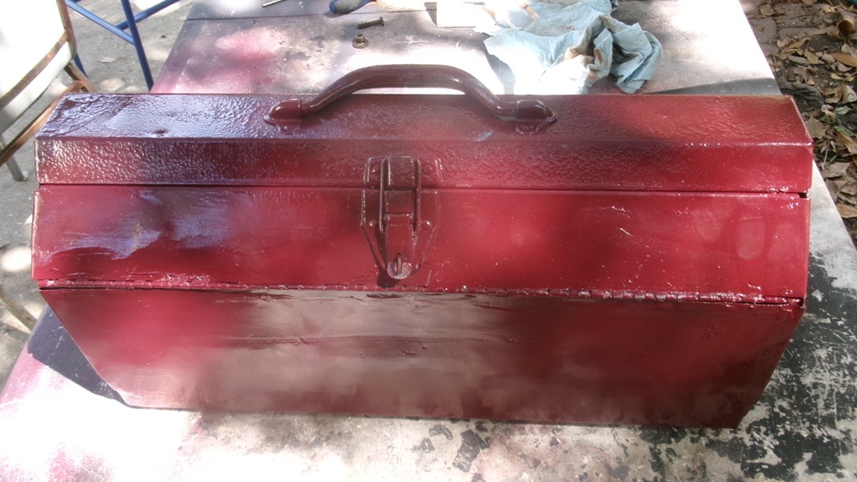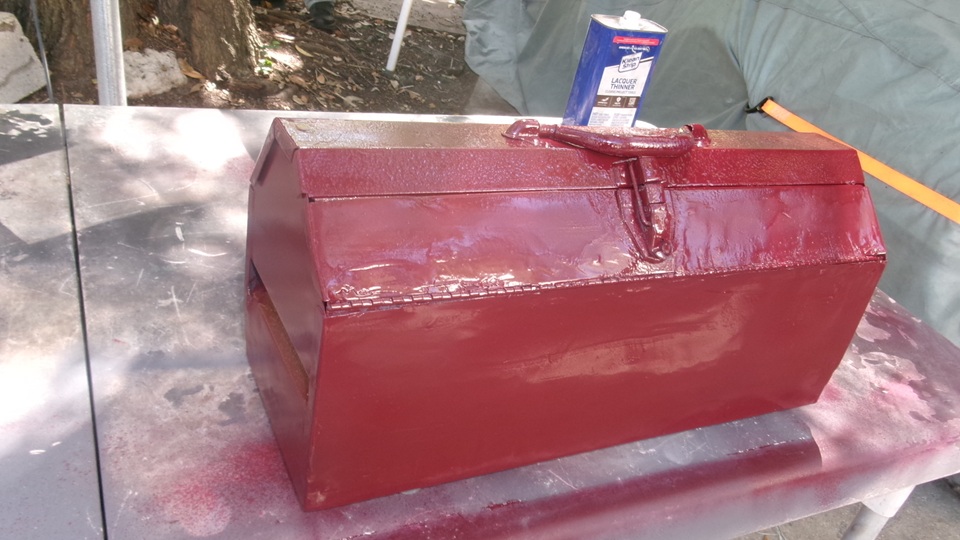 Nothing as boring as watching paint dry, so this will be a short work day. Grab a couple of paint cans, and spray something red on the tool box, inside and out, and on the bottom, top, handle and latch parts of course. Sitting on four large hex nuts so it doesn't stick to the table. Set that aside under the canopy, and we will get back to it again another day.