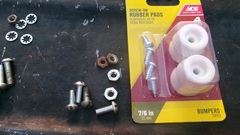 Finishing the tool box today, drilling holes to install rubber feet with short #10 screws. Thin lock washers and hex nuts underneath inside the rubber bumpers, with one flat washer inside the box under the screw head to shorten the screw length a bit so it does not extend below bottom of the foot.