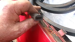 Now we spend a few more minutes replacing the weather seal for the MGA boot lid (again). Pull out the fat rectangular foam rubber strip that would not allow the lid to close. Install this hollow rubber strip that will compress easier to allow the lid to close with a moderate push. The 3M weather strip adhesive was very sticky stuff, too easy to get stuck on fingers (and paint), too hard to remove, but it does wonders for holding the rubber strip in place.