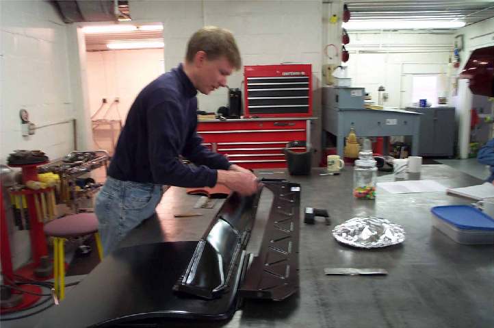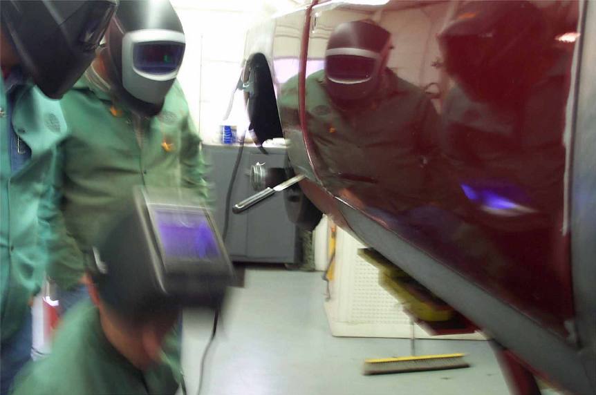 Final fitting of panels is done by cutting the patch panel oversize and trimming as many times as it takes to get the fit almost perfect. A very slight gap is necessary between the sheets to be welded, and great care is exercised to control the width of the gap, as it is affected by the welding process.