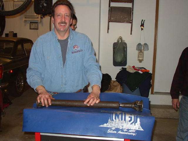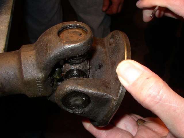A dozen CMGC members assembled to R&R the universal joints in the MGB propshaft. Most of them had never seen it done before, so there were lots of hands in the pockets for a while. Disassembly wasn't too difficult, just a little tricky. Remove all of the snap rings and tap the side of the yoke until the bearing caps come out the ends. Unfortunately one of the caps was pushed in until it dropped into the middle of the yoke, after which it was a bit of a challenge to get it back into the bore to drift it to the outside.