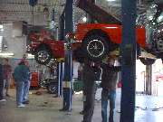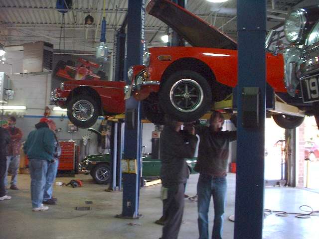 The spring Tune Up Party is one of the club’s oldest and most popular events. This year, after many years of a Sunday morning venue, we switched to Saturday afternoon April 26 to accommodate our host, Mark Leuck, at his new shop in Willowbrook, IL. Mark provided access to four lifts for four hours, during which time numerous club members has a chance to view – and tinker with! – the underside of their car without laying on the ground. Cars seen on the lifts included: MGC, MG-TD, MG Midget and MGB. As usual, a few surprises were found giving the owner’s a head-start