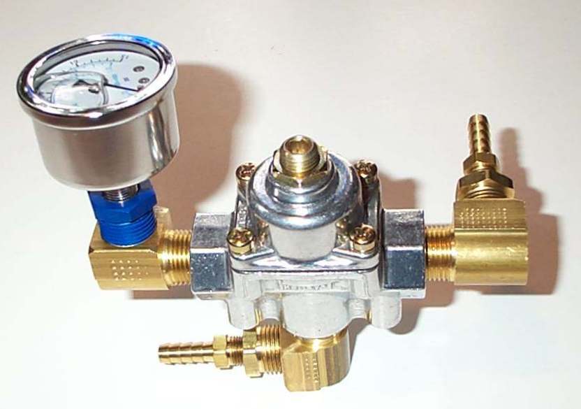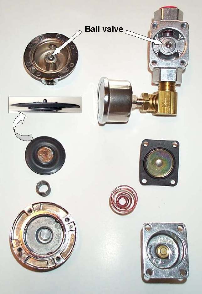 Since we were not willing to trust the calibration of this type of regulator, we invested in a genuine Holley pressure regulator. We also ordered a pressure gauge at the same time. The disassembled Holley regulator is shown on the right in photo above. The operation of this regulator is similar, but the diaphragm consists of a rigid frame that is connected to a central metal plate by a narrow circle of rubber. This seems to us to be an improved design, but apparently these are also prone to failure with time, because replacement diaphragms are available. Yes, we added one to the order.