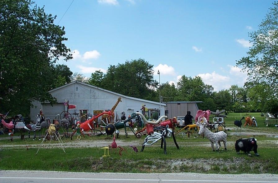 Since Interstate 57 might be described as tedious at best, we would like to share an alternate route with those who might have the occasion to travel by MG between Chicago and Champaign. Several years ago, we were among a group that Barney Gaylord led back to Chicagoland after the Champagne British Car Festival. We have used his route ever since, as have several other CMGC members, and, with Barney’s permission, we would like to describe it for everyone else. As a common embarkation point, we will use the junction of I 55 and IL 53, which is known to many club members as the meeting point for caravans to the now-defunct Utica, IL go-kart track. Follow I55 south to exit 238, the first Braidwood exit, and take IL 129 into Braidwood. Turn left onto IL 113 and proceed through the southeast corner of town, then 1 mile due east. Turn onto Essex Road, the first major road to the right. According to a penciled notation on one of our older maps this is also County Route 41. Passing through Essex, watch on the right for an assortment of colorful and fantastic metal sculptures.